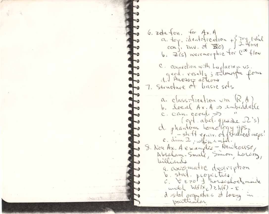 Zeta function for Axiom A flows and systems topological identification (try 1-dimensional $\Omega $ first); conjugacy invariance of $\zeta (0)$. For $C^\infty $ flows, $\zeta (s) $ has a meromorphic extension to the complex plane. Connection with Laplacian vs. geodesic results; automorphic forms. Anosov actions.