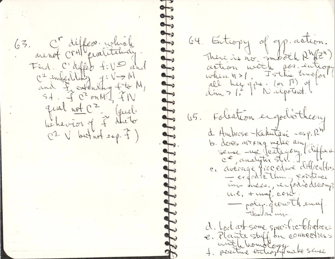 Foliation ergodic theory Ambrose Kakutani (in particular, question 39) Does mixing make any sense? (use category, differentiability, $C^\infty$, analytic structure) Averaging procedure difficulties: ergodic theorems, existence of invariant measures, ergodic decomposition, unique ergodicity and uniform convergence. polynomial growth … Look at some specific foliations Plante’s stuff on connections with homology Does pointwise entropy make sense?